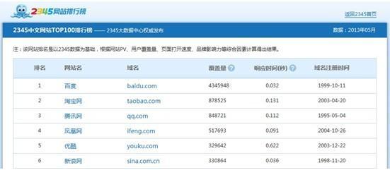 此次,2345試水網(wǎng)站排行榜領(lǐng)域,期望能滿足用戶對(duì)于互聯(lián)網(wǎng)動(dòng)態(tài)的更多需求。在排行榜中,每位用戶均可查看到網(wǎng)站排名、域名、覆蓋量、響應(yīng)時(shí)間及域名注冊(cè)時(shí)間。如點(diǎn)擊網(wǎng)站名或域名都可直接進(jìn)入相應(yīng)網(wǎng)站,這樣可方便網(wǎng)友即時(shí)瀏覽和使用喜愛的網(wǎng)站。在TOP100榜單中,隨處可見一些大型的門戶網(wǎng)站和垂直類網(wǎng)站。百度、淘寶和騰訊位列TOP3,而鳳凰網(wǎng)、優(yōu)酷、新浪、搜狐、新浪微博則緊隨其后。人人、天涯、開心、豆瓣等社交網(wǎng)站和熱門社區(qū)也聚集了大量人氣,均取得了不錯(cuò)的排名。不過,互聯(lián)網(wǎng)的動(dòng)向總是瞬息萬變,各網(wǎng)站的排名也并非一塵不變,2345將實(shí)時(shí)更新網(wǎng)站排行榜,將最新最全的排行榜呈現(xiàn)在各位用戶的面前。